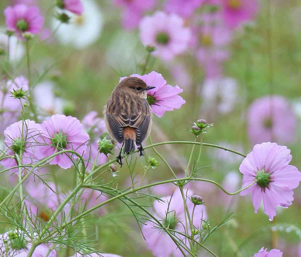 コスモスのような柔らかい茎にもノビタキちゃんとまるんですね。🐦