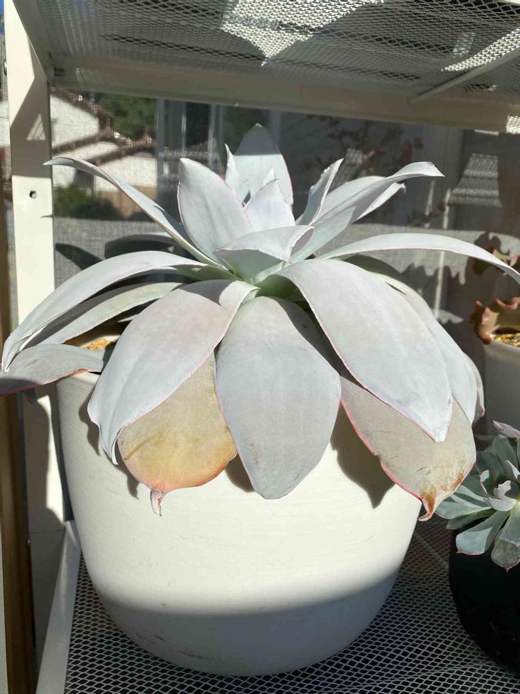 下葉が垂れて来るのは日照不足です。うちの場合は雨の日以外15時頃まで直射日光浴びてます。(春先から慣らしてるからか?粉纏ってるからか直射でも葉焼けなし)乾燥すると下葉がすぐ枯れて来るので乾いたらすぐ水遣りしてます😊参考までに🙏