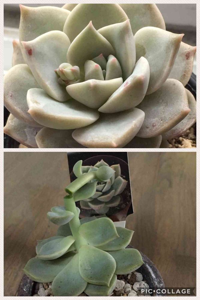 上と下の子多肉ちゃん好きな方は分かるかしら❓😬同じ白牡丹ですが下は我が家にいた子、上が先週お迎えした子この形状がいつまでも続くと思ってた私がバカでした😅そして伸び過ぎて棚の天井に到達してポッキリ折れてしまってまして😨上の子は花目が出て来てると言うのに…🤨チョンパ✂️して仕立て直し春には日差しに当てるからね〜〜💧