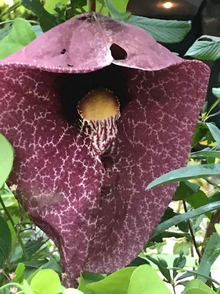 アリストロキア ギガンティア 開花しました。手のひらより大きな花です。冬は地上部全て切り、室内越冬させています。