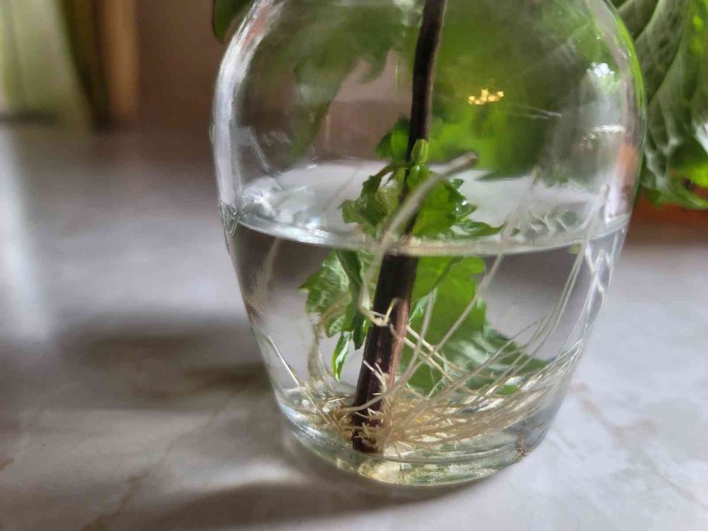 バルコニーで育ち過ぎて他の植物に日が当たらなくなっていたのでカットしてキッチンへ。水にさしておいたらどんどん根が出てきました😍