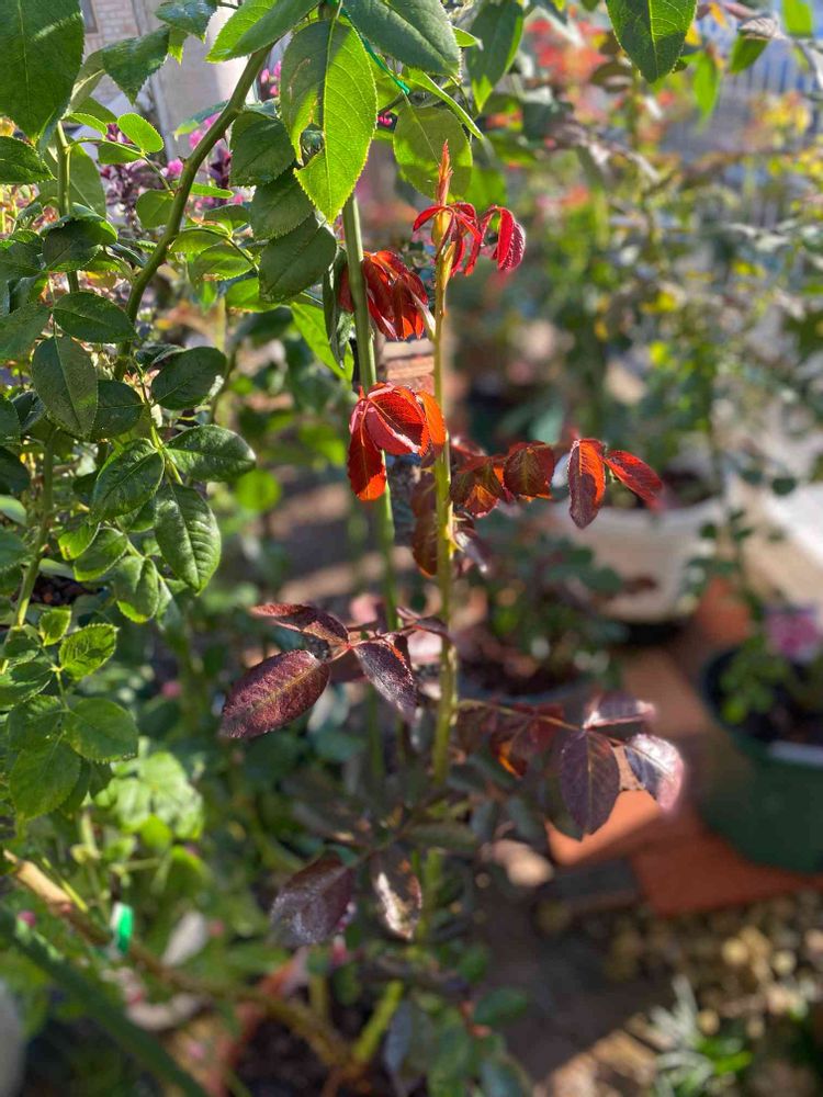 今年の春買った新苗ピエールドゥロンサールの立派なシュートが出てます葉🍀🍀どんどんツルも伸びてます。この子を何処に置いてどんな風に誘引するか全く決まってません😭😭悩み中…🤔💭…🤔💭