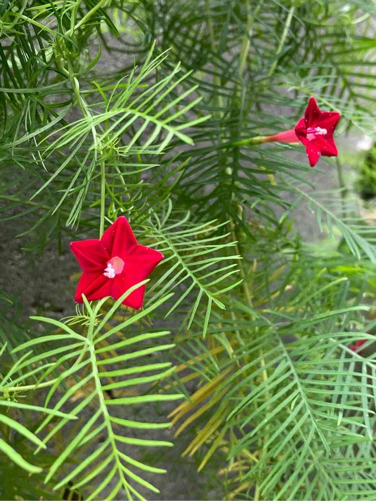 こぼれ種のルコウソウ🌸葉はよく茂っているのに🤔 夏の暑さの中真っ赤な花とおもっていたのですが、秋の花になってしまいました。お会いできて嬉しいです。💕