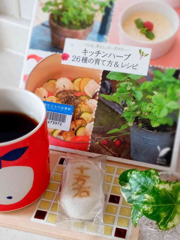 午後のコーヒータイム♪今日のおともは十万石まんじゅうと図書館で借りた本。