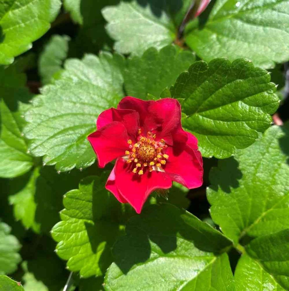 真っ赤な苺の花が開花中!サントリーの苺苗 ローズベリーレッド。