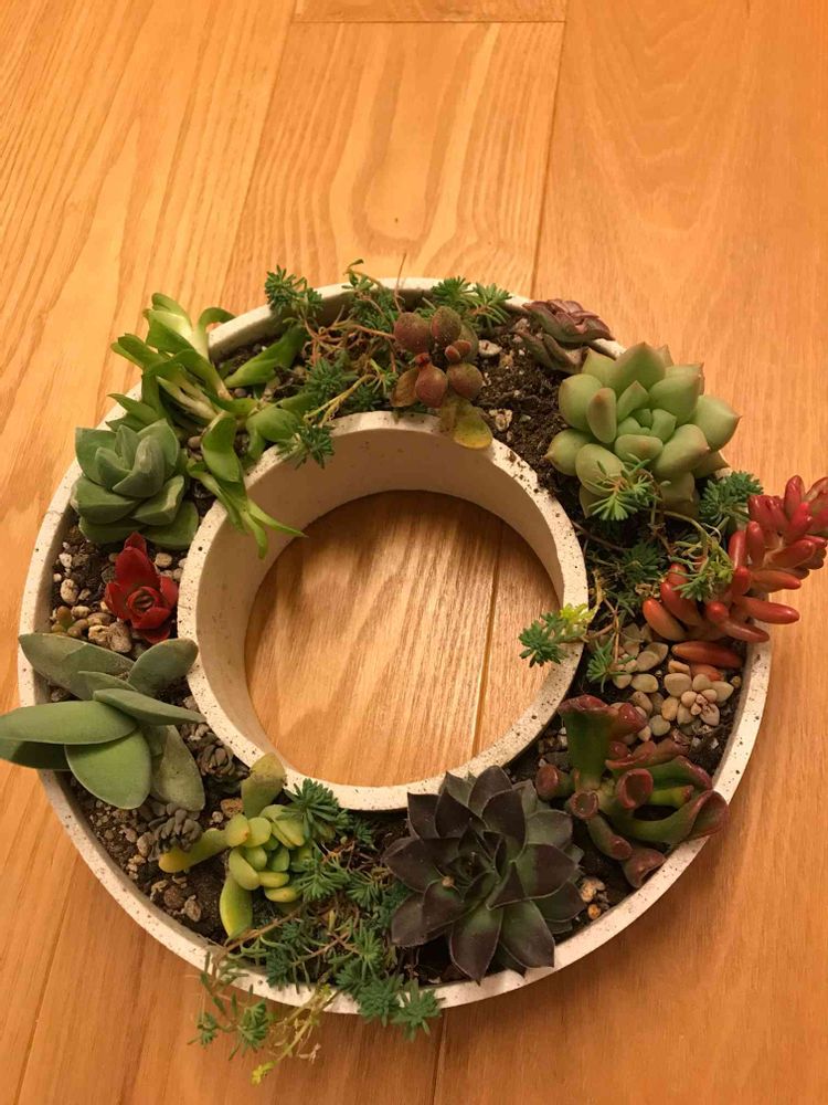garageで見つけた、ドーナツ型の鉢に寄せ植え。センス良く植えるって、ムズカシイ💦