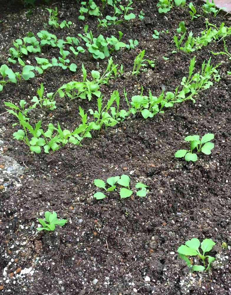 9/10に実家の花壇に巻いたサラダ蕪と早生ミズナそれに中生丸葉小松菜! しっかり発芽しましたが、サラダ蕪は一部野良ニャンさんのトイレとなってました🤣