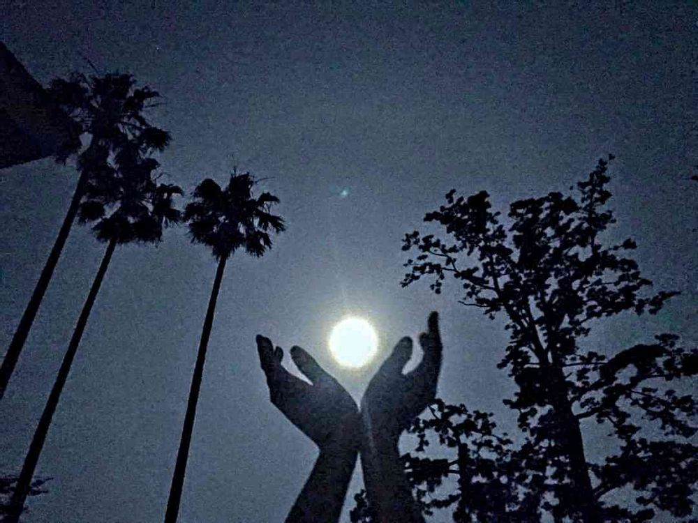 月をも手の内に掴もうと、月が宝石のように輝いて見えます🌕