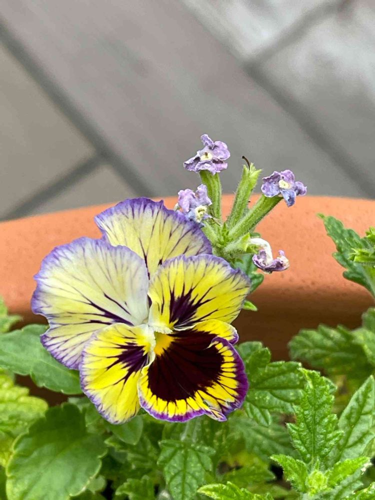 バーベナを植えてある鉢に、その前に植えてあったパンジー(ビオラ)の零れ種から花が咲いたようです