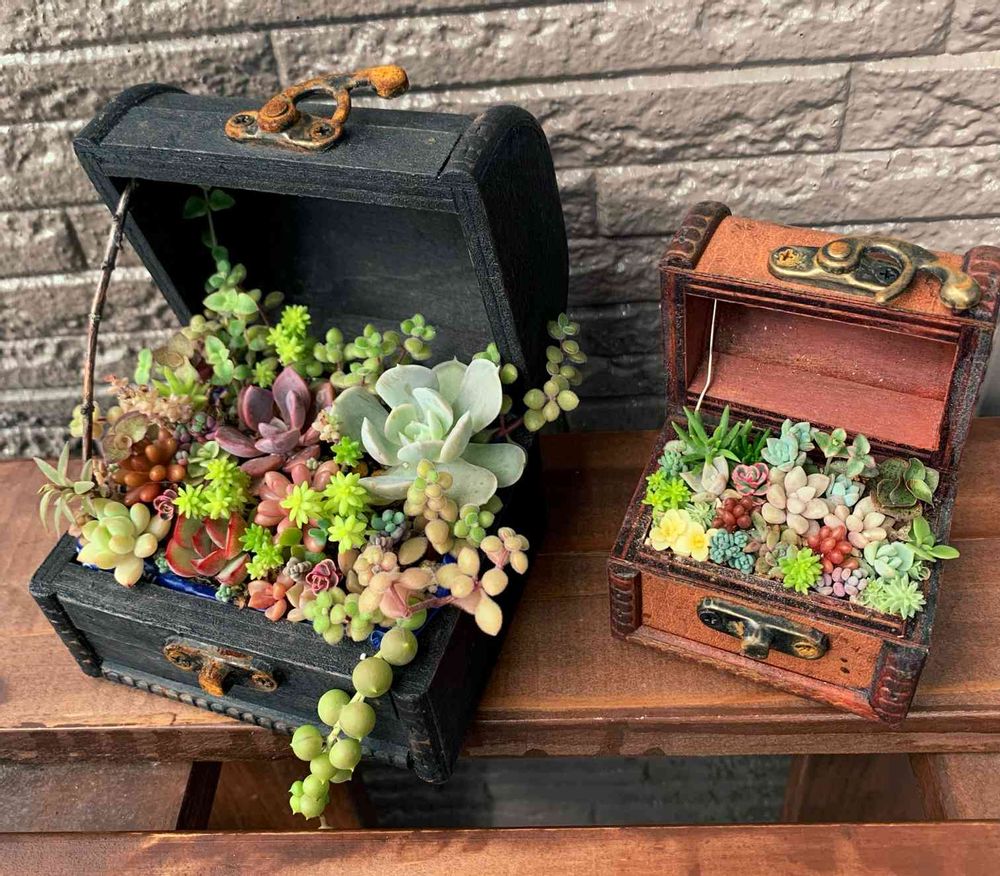 宝石箱の中に多肉植物がぎっしり詰まってますけど、😳どうやってそんな寄せ植えができるのか不思議でなりませんねぇ…