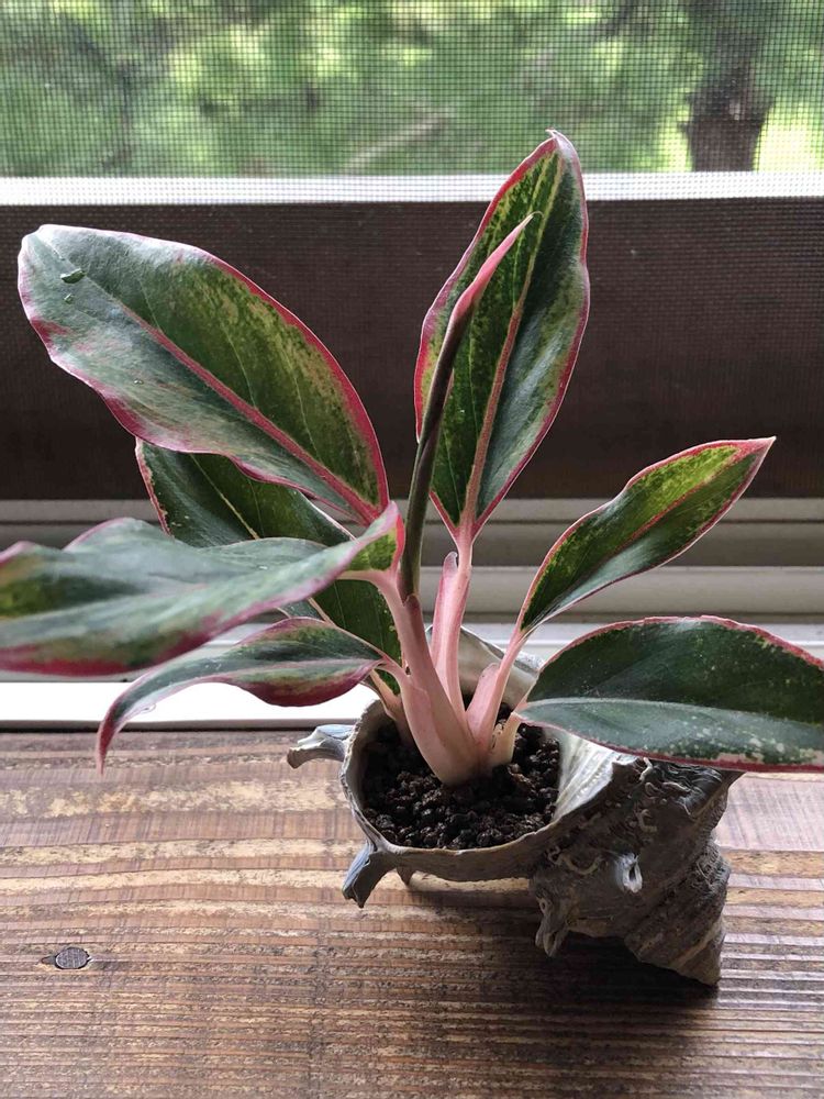 アグラオネマの植え替え中、不注意で折ってしまったので、サザエの殻に赤玉土を入れて挿してみました。