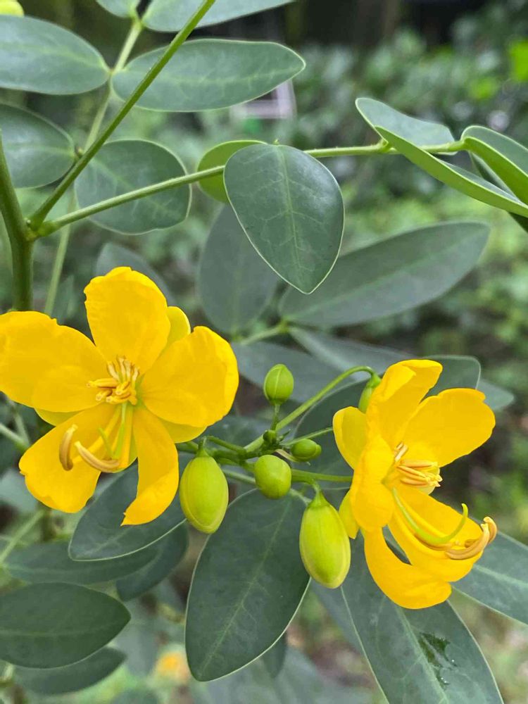 ☘️コバノセンナ☘️.....いきいきとした黄金色のお花&かわいい楕円形のこの葉っぱが好き〜🤗✨へぇ、南米原産のマメ科センナ属なんだ。