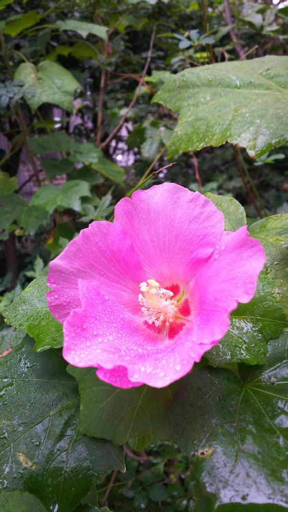 雨に濡れたピンク色の芙蓉が綺麗です。