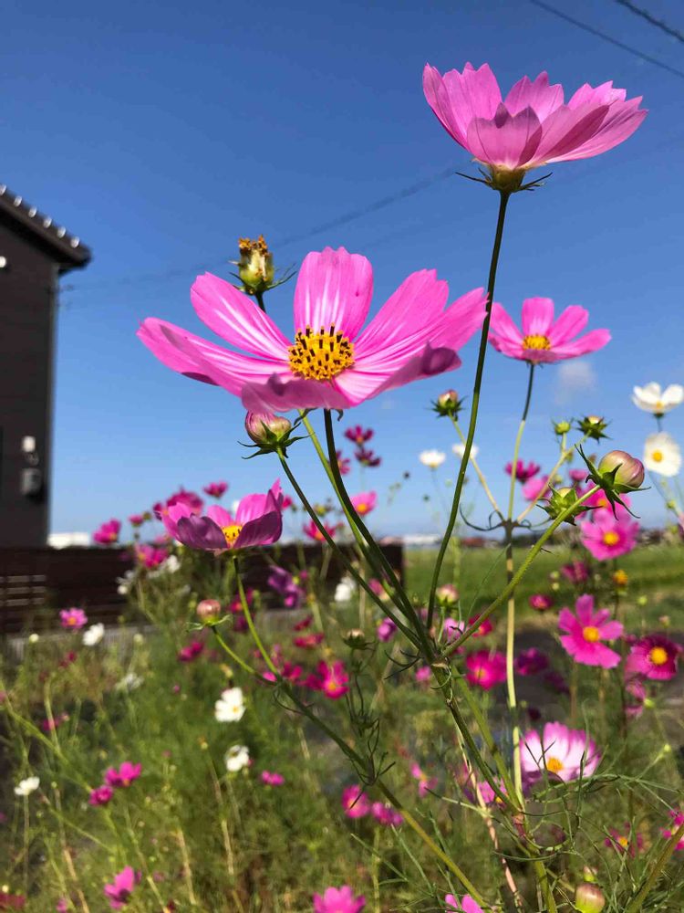 青い空にピンクのコスモスが映えて とても綺麗ですね〜。