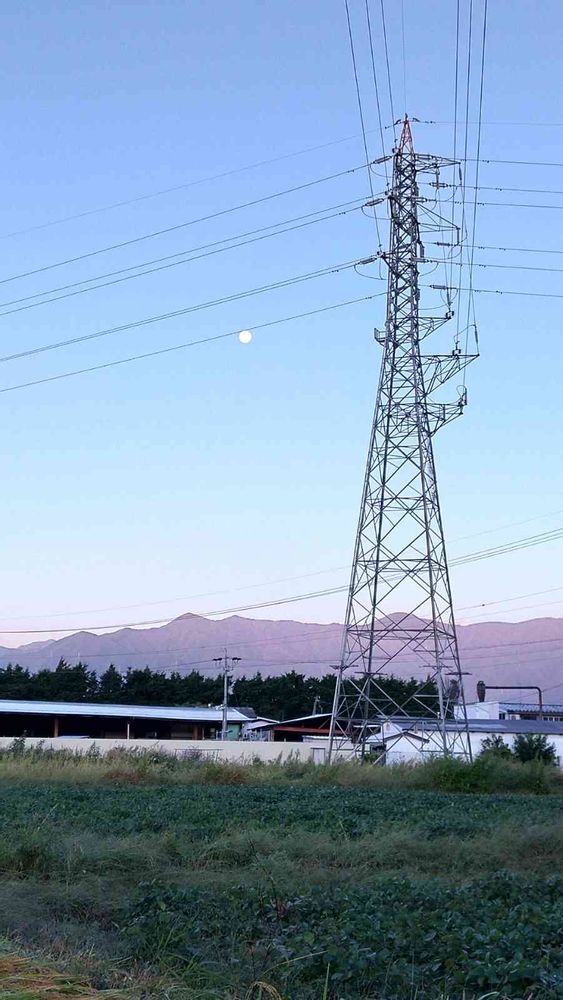 朝のお散歩で見つけた、高圧線に引っかかった月🌕アルプスもきれいです。
