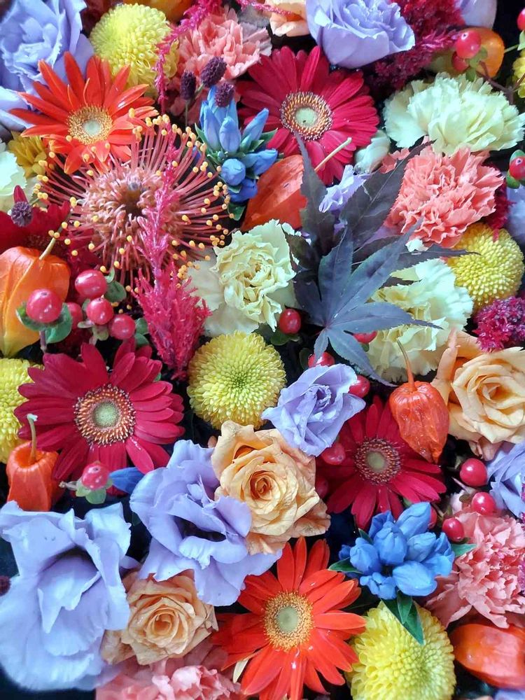 秋っぽい、ハロウィンを意識している感じの鮮やかな花手水ですよね😊🎶