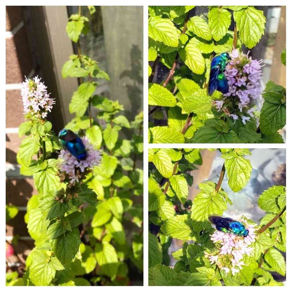 🐝ブラックオパールのようなキラキラ蜂がミントの花に飛んできたよ🤓🤔😙