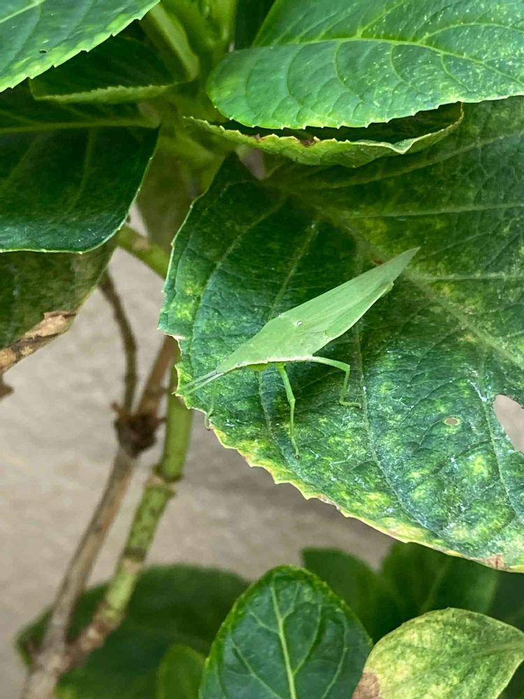 なんかいてる⁉️バッタ🤔❓ググッたらクビキリギスっぽいΣ(゚д゚;)どうする❓そのまま❓駆除❓って言うかここ8階やで‼️どうやって来たσ( ̄^ ̄)?まぁ〜イイか😤ちなみに植物はアジサイです。
