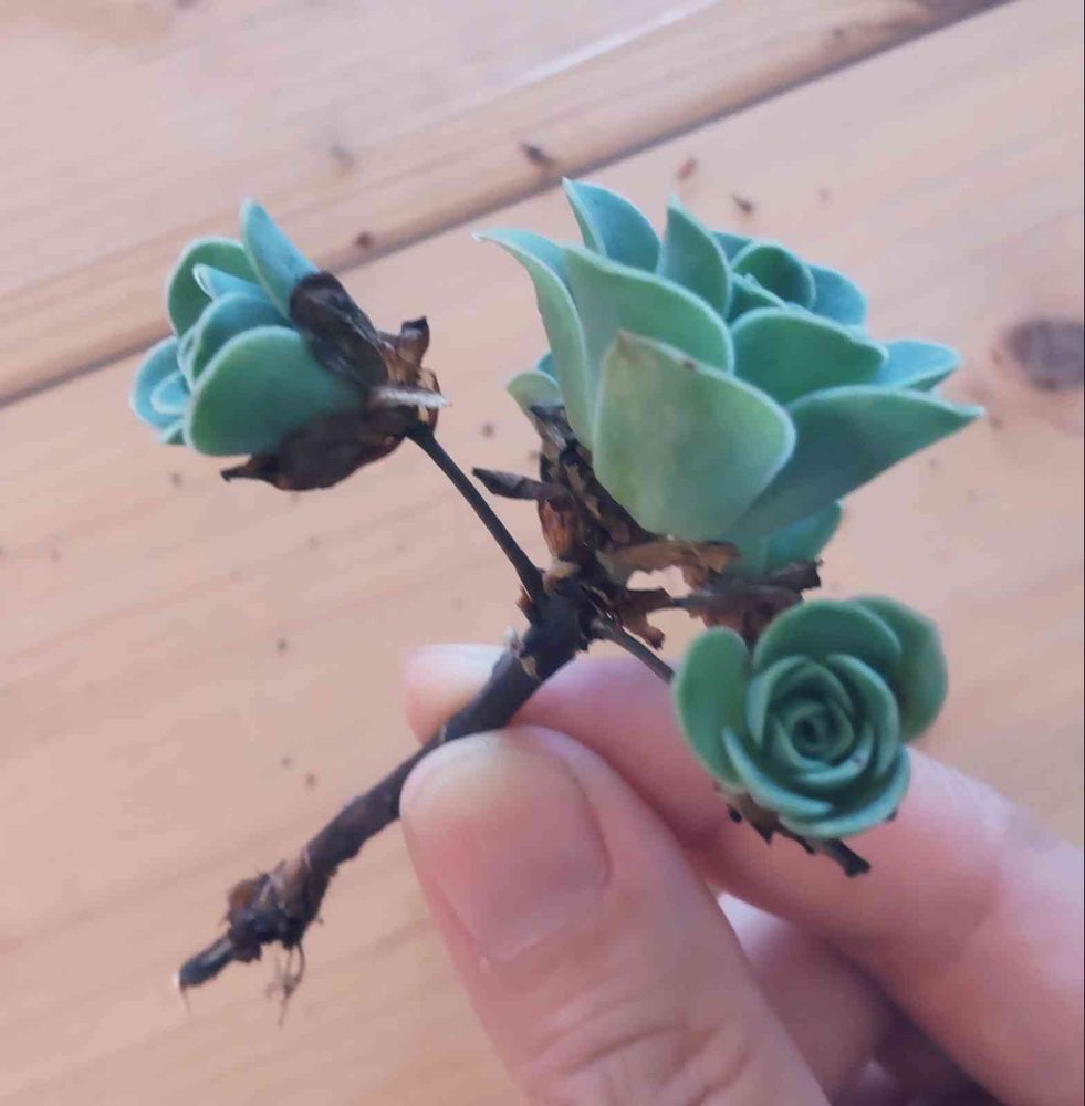 ドドランタリスですが親株から子株が孫をつけて枝を伸ばしていてたので離して植え替えをしようと思っているんですが、枝の部分が長くこのまま挿すか、指でつまんでるあたりでカットして挿すか悩んでます💦ちなみに写真は親株から切り離した子&孫です
