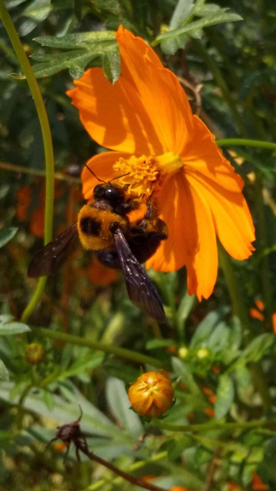 今日も「キバナコスモス」にクマバチ🐝さんが来ました。お食事はお花🧡の蜜🍯かな?花粉🍙かな?🤔😄🌞