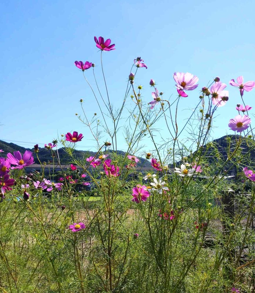 コスモスとお山 青空の景色 綺麗ですね😃