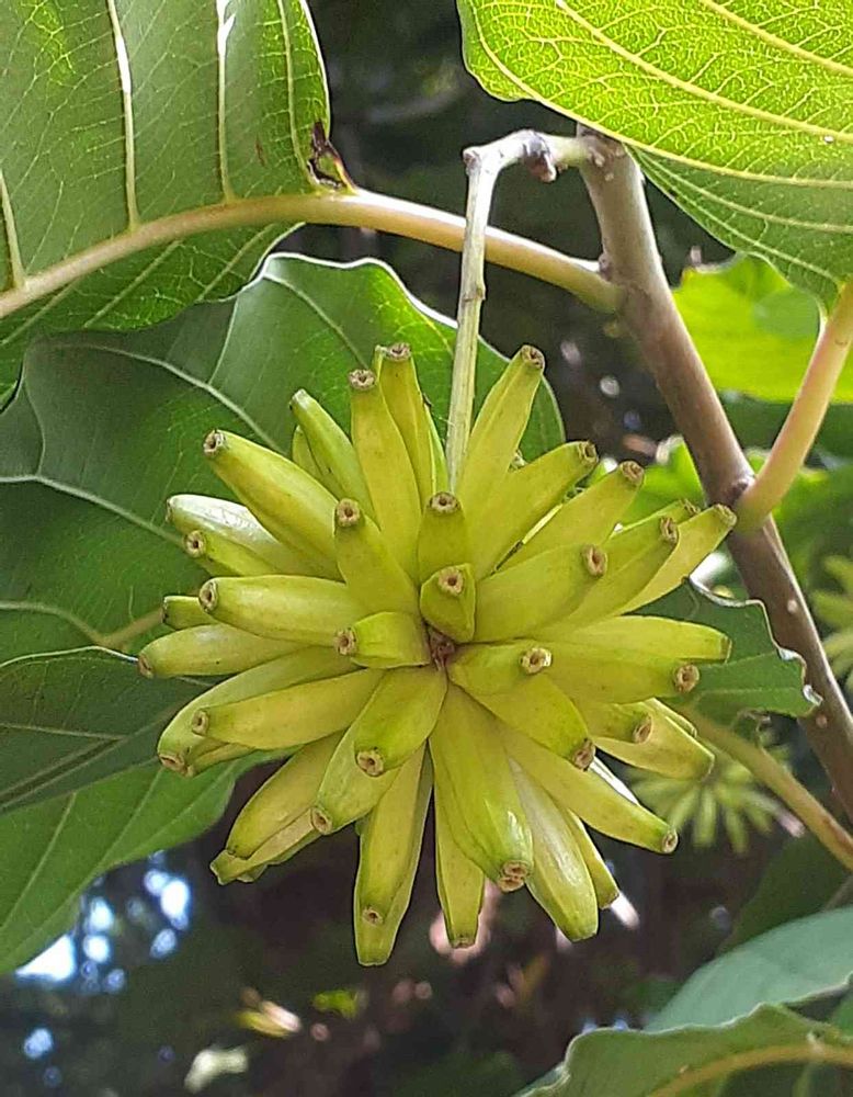 15~20mの高木、上の方から下までびっしり実がなっています。暫くすると🍌から松ぼっくり色になります。