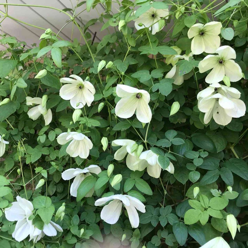 深い緑の葉と真っ白な花弁との対称が美しいクレマチスです。花芯の薄緑も愛らしい。今年の夏は暑すぎて2番花はつるがたくさん伸びたのにあまり咲いてくれませんでした。(この写真は2021.5.12撮影)他の種類は皆たくさん咲いたのに酷暑は苦手でしたね。ベランダで西陽が当たる場所なので可哀想でした😵来年は場所を移動しようと思います。