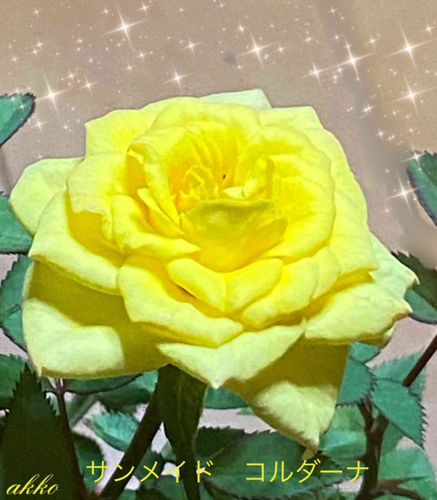 輝くような黄色い、半剣弁咲の可愛いバラです💛