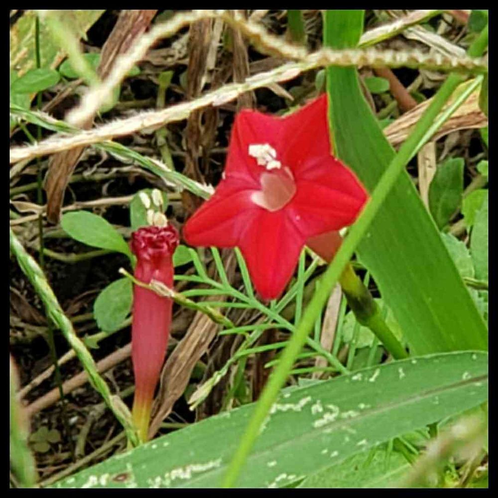 その昔、赤い折り紙でこ~んな形の5角形の花を折ったことを思い出します。この花はヒルガオ科、サツマイモ属非耐寒性つる性多年草の、ルコウソウ‼️本来多年草ですが寒さに弱いため園芸としては1年草と扱われています。花言葉は→常に愛らしい、元気、繊細な愛など、、、