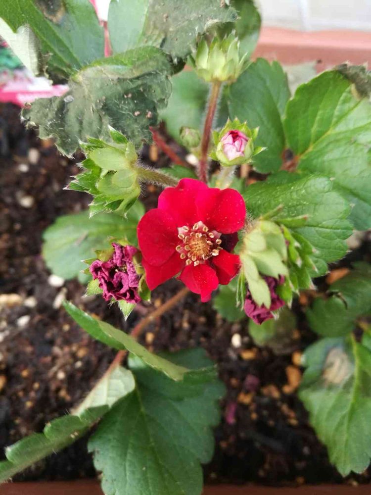 こんばんは。私は去年今頃同じいちご買って植えました。早春からずーっと今も赤い花咲いていますよ❗いちごは、鳥のエサ、花を楽しんでいます❗