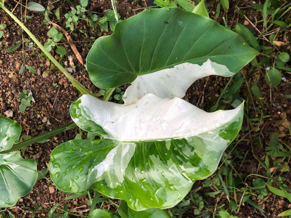 もう少しでハーフムーンって感じの斑入りクワズイモ 。子株を選抜していくことでいい感じのできるかな〜?