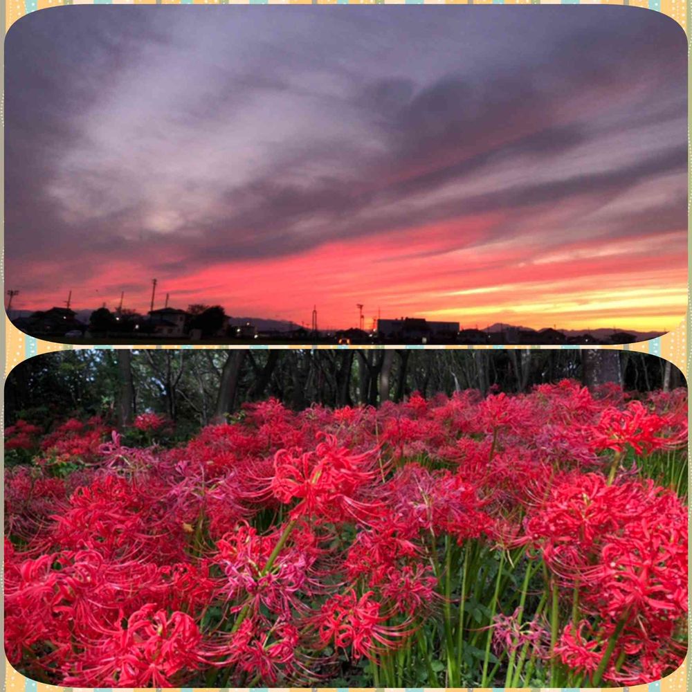 今日の夕焼けと、燃えるように咲く彼岸花😍赤って不思議、心に刺さります😃❤️
