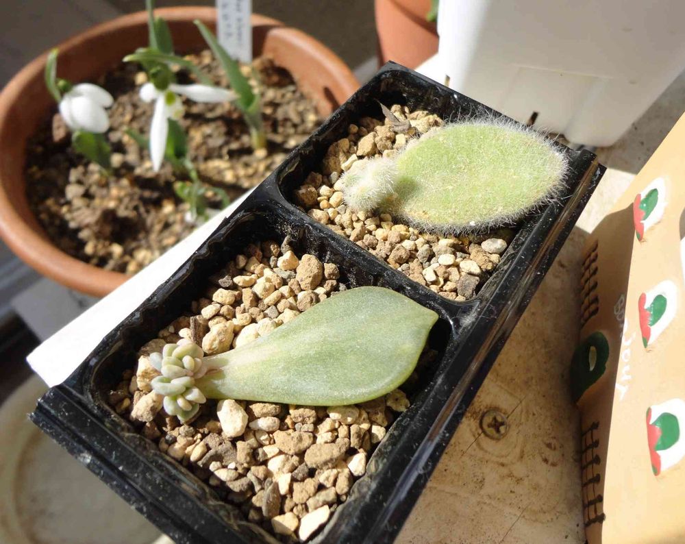 寒い間もじわじわ育っていたアンゴラ兎と東美人錦の葉挿し。