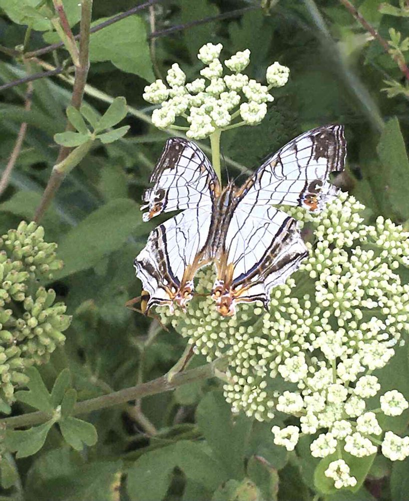 わぁぁ〜珍しい柄の蝶🦋ですね〜😳白いお花もキレイですが、蝶のインパクトが強すぎる〜😆