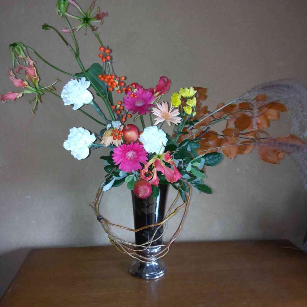 材料はツル梅モドキ、ススキ、ガ―ベラ、姫りんごです。