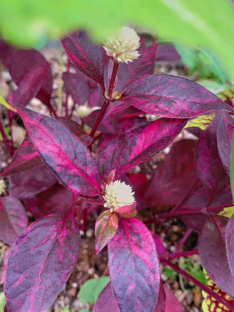 千日紅の赤い花、ピンク色の花、白い花色々ありますがどれもキラキラの星を付けてかなりの自己主張ですが、この花は少し違いますね。自然体、自然体は優しい感じその代わりに葉っぱ見せてるのねー