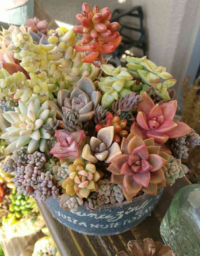 寄せ植え、カラフルでなんだかパステルカラーだね🎶 こんなに可愛く色付いている子はうちにはいないよ💦