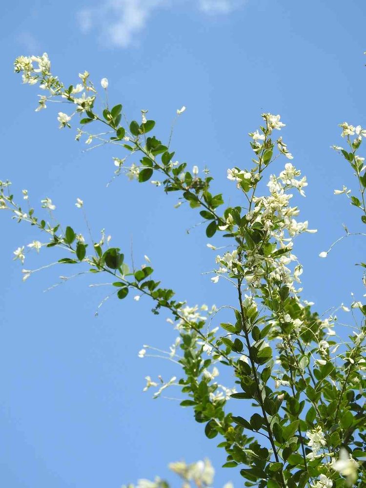 民家の庭先で青空とコラボする白い綺麗な🤍🌼ハギの花🤍🌼