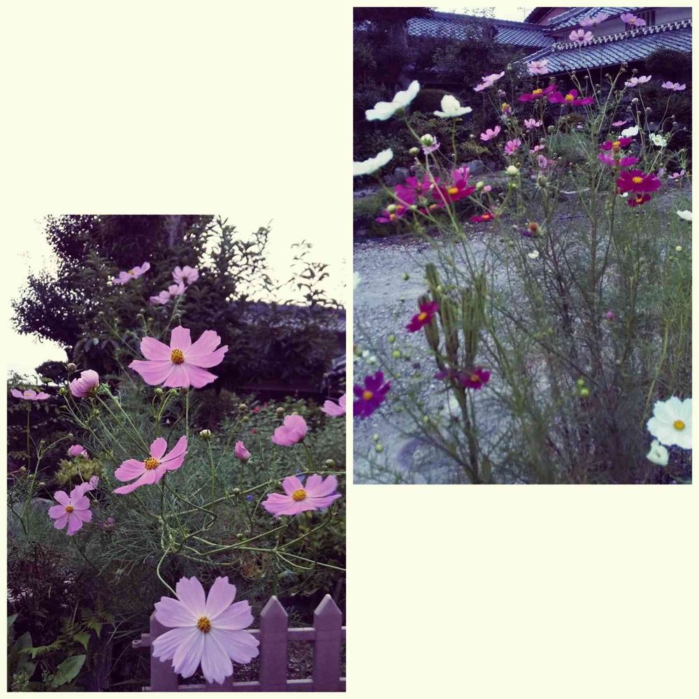 右は 砂利の所に昨年種を落とした、肥料も無しでもこんなに咲く。後ろの家は、隣の家と我が家の古い家が写ってる。