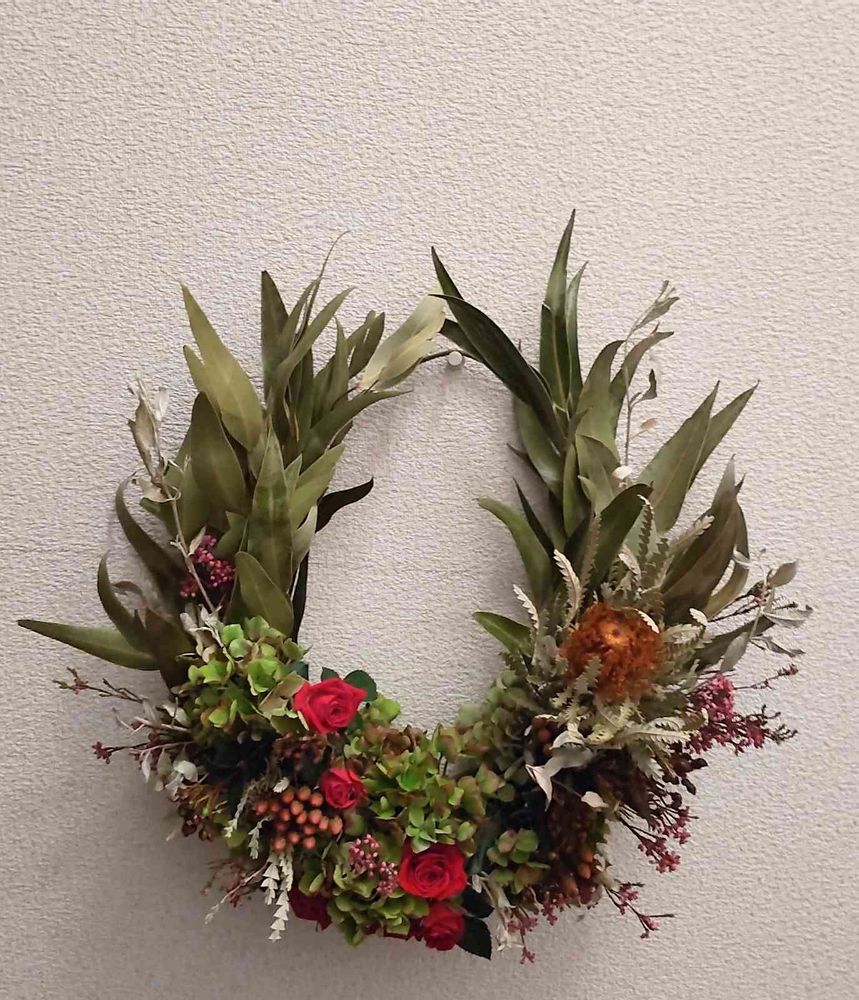 アクアサークルの半分にドライフラワーと生花を入れリースを作成。ユーカリロングリーフで形を決めるのが難しかった〰💦