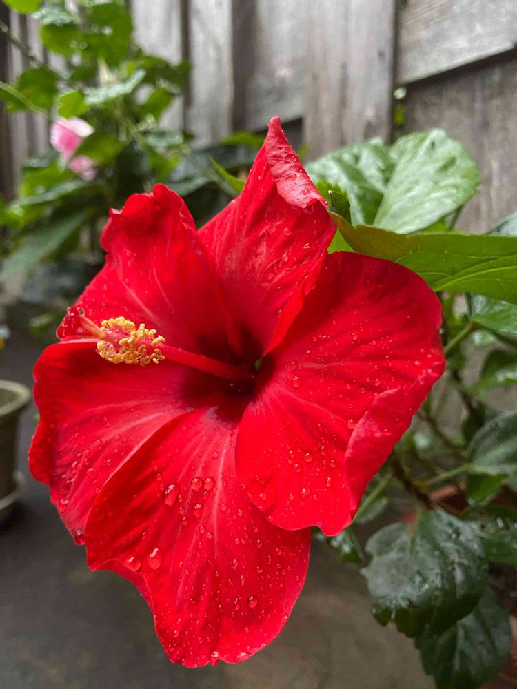 それがねぇ、真っ赤なハイビスカスは、今朝も咲いてるー🙌