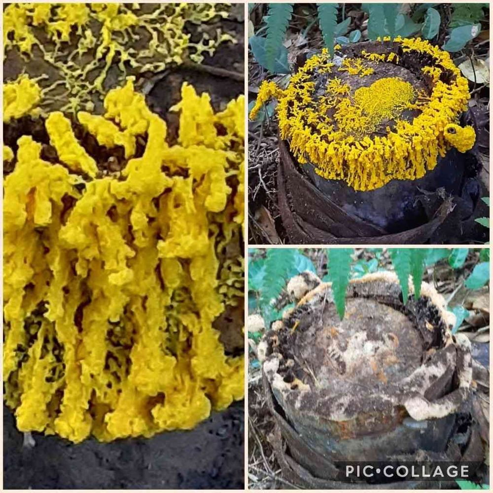 今月の初め頃、雨☔の続いたあと、裏庭に出てみたら、裏庭から竹林へと下りるところの梅ノ木の足元の孟宗竹の古い切り株がこの黄色い正体不明の生物?に覆われていたのです⁉️👀‼️