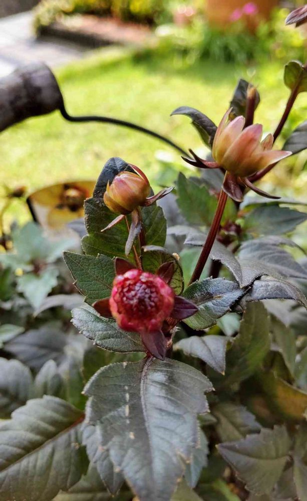 夜中に、ふと目が醒めた〜土砂降りの雨音に〜☔😉ー先日、写しておいた〜プチダリア⭐ハミングブロンズが、いまにもさきだしそう〜🎵🌼銅葉が、渋いです😊〜交配を、繰り返し、誕生したとか😉⭐🎵