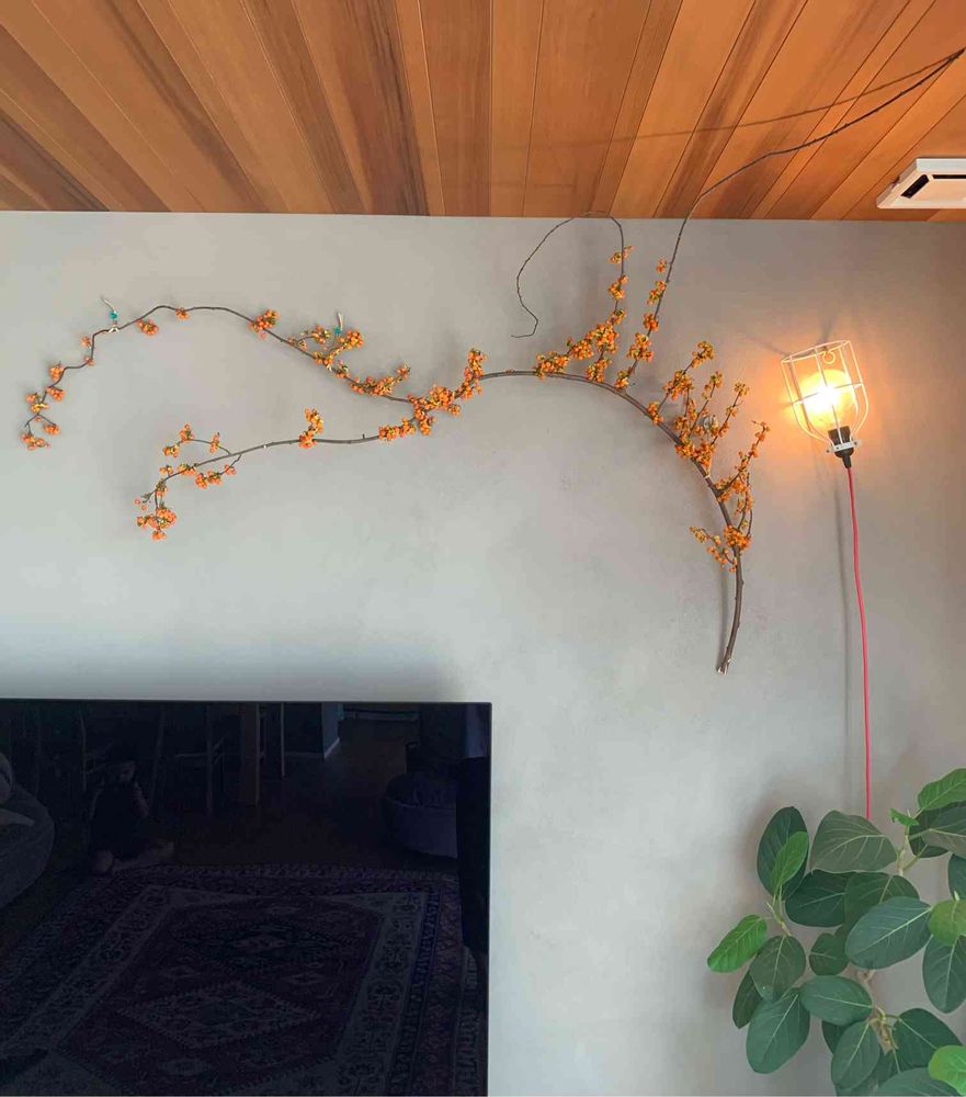 テレビの上に、オブジェみたいな枝を飾り、一気に秋めいた空間になりました〜