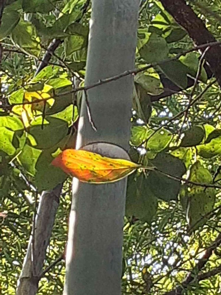 ふと見上げた先に、1枚の柿の葉が陽射しを浴びて紅葉🍁してた🎵
