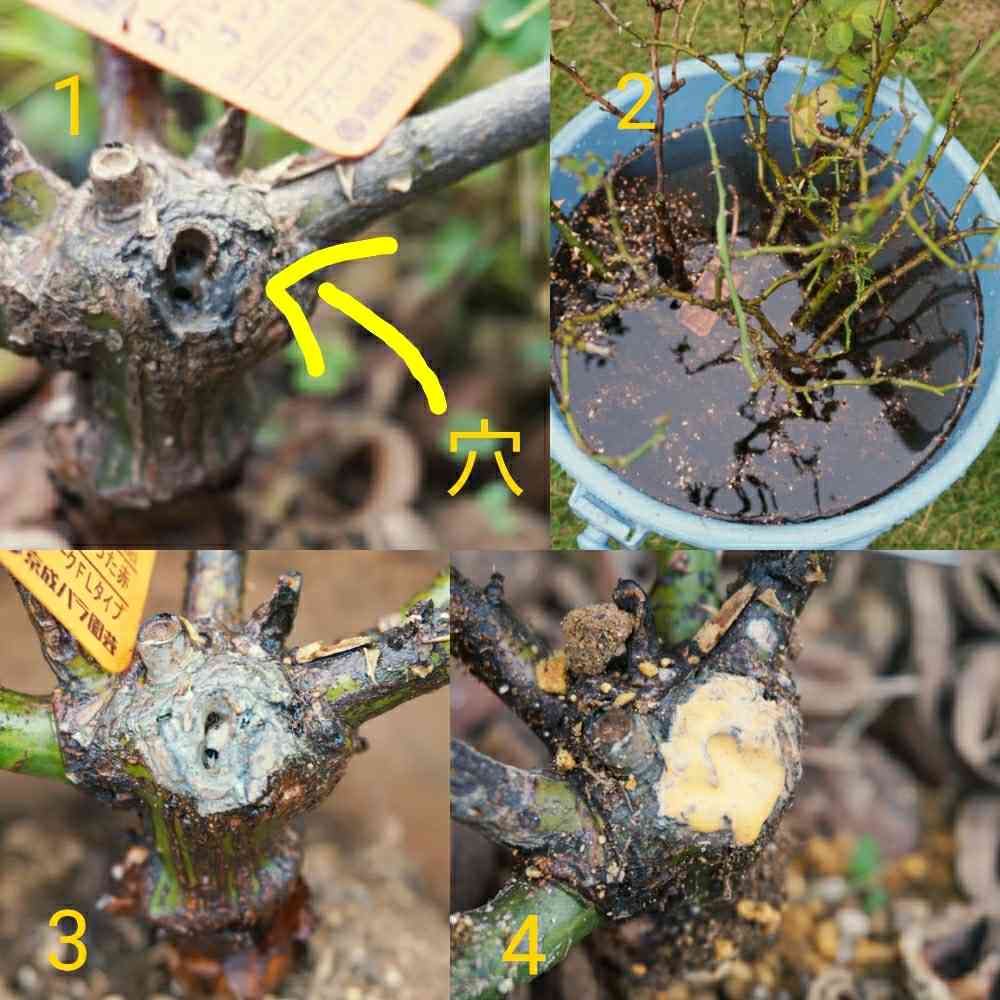 3は、小一時間、水に浸けた後に取り出しました。これなら穴の中にいても、幼虫は窒息死してるでしょう…たぶん😅