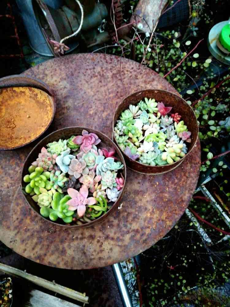 錆びテーブルの上に錆び鍋と錆び器にカット苗🎵錆びづくし😁