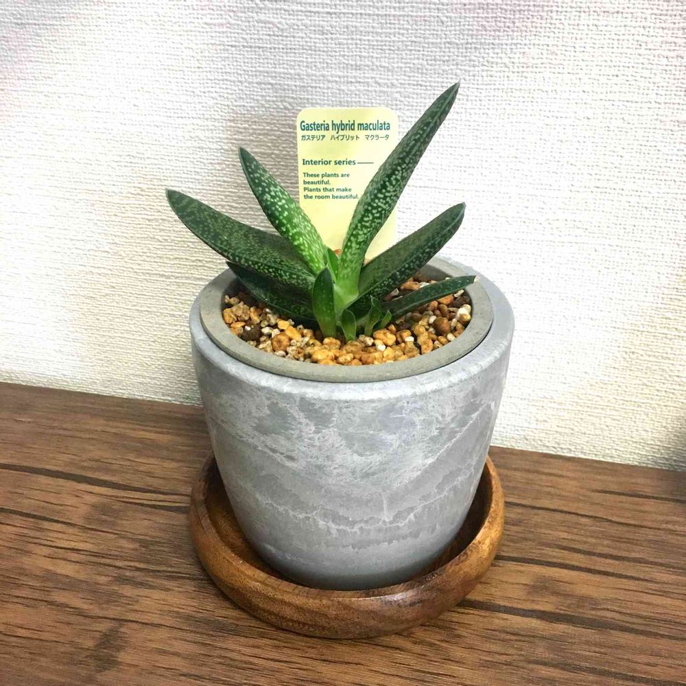 鉢はよく見るとわかるのですが底に穴の空いた鉢にガステリアを植え替え、さらに穴なしのおしゃれな鉢を被せました。受け皿はする必要ないのですが安定感のために置きました。