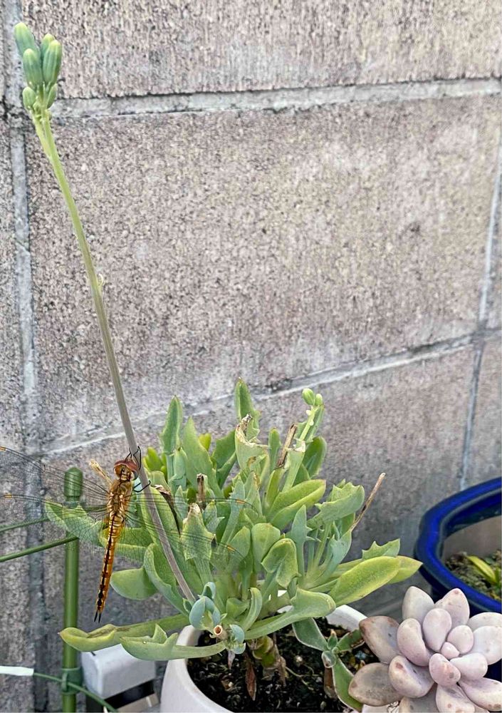 仕事から帰ってみると、マサイの矢尻の花芽にトンボさんが‼️👀