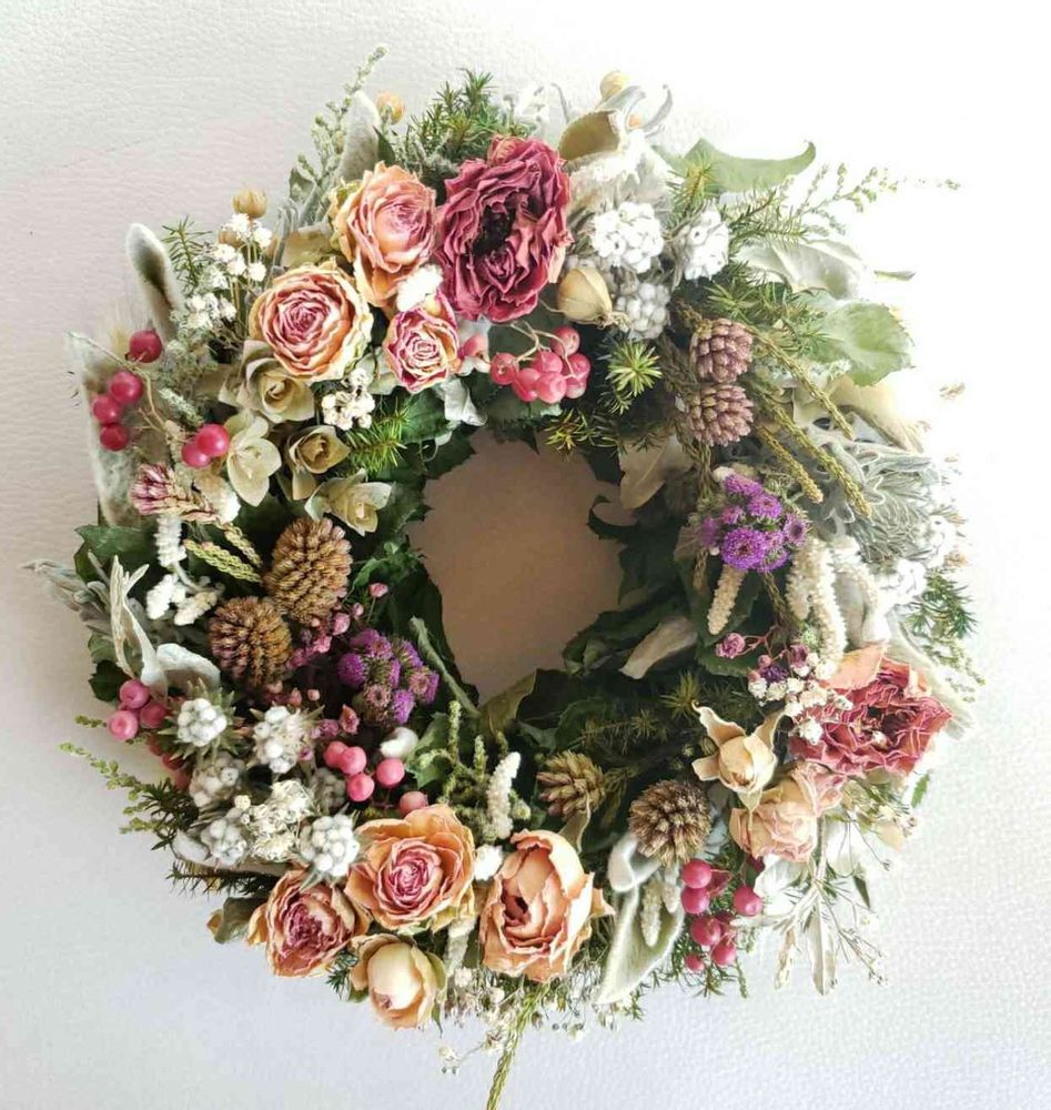 ファンシーローラなど、ピンクの可愛らしいバラを集めた小ぶりなリースです。